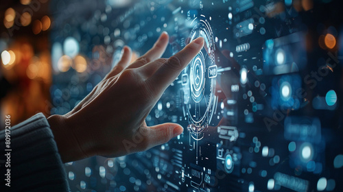 Woman in front of transparent touch screen pressing buttons. Information Technology. Internet of Things.