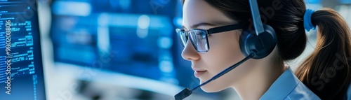Woman in Glasses and Headset Looking at Computer Screen with Code