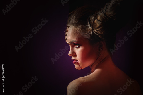 Woman in Halloween makeup with hairstyle in form of horns, Devil Queen