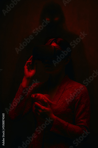 "Woman in Red Kebaya Wearing VR Headset with Ghostly Shadow Behind – Horror Cinematic Scene"