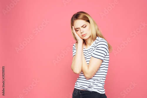 Woman in striped t-shirt emotions studio cropped view lifestyle pink isolated background