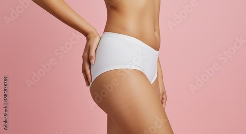 Woman in white underwear profile view pink background