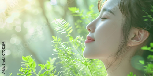 woman is smiling side face, in the style of light emerald and white, organic, a plant, soft atmospheric light, generative AI