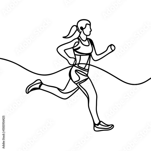 Woman jogging in minimalist one-line drawing. Woman jogging with continuous line, wearing sportswear and running with ponytail, in linear design. Conceptual woman-jogging,
