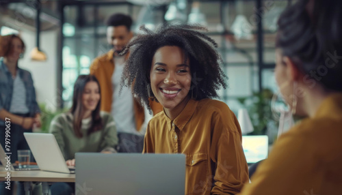 Woman, laptop or office or working with smile for startup, happiness for career in business. Female person, graphic designer or computer with colleague for chat or ideas, plan for website development