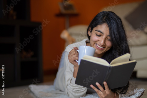 woman lying down reading with cup of coffee in pandemic house, coronavirus quarantine in mexico