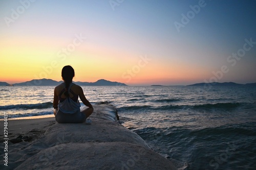 Woman meditates - relaxes at sunset by the sea on the beach. Concept for yoga, health and spa.