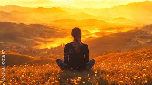 Woman meditating on a rock enjoying the sunrise over the mountains