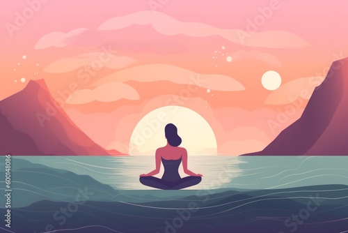 woman ocean lotus yoga back asana relaxation sea person exercise meditation. Generative AI.