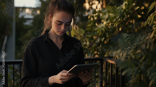 Woman on Balcony: A young woman, dressed in black, stands on a balcony, her focus intently on the tablet in her hands. As the day draws to a close.