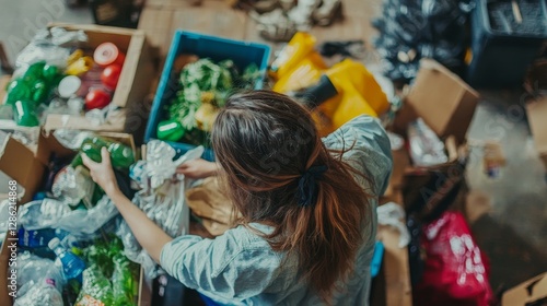 Woman Organizing Recyclable Materials in a Community Recycling Center with Care
