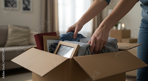 Woman Packing Personal Belongings into Cardboard Box for Moving