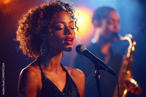 Woman passionately singing into microphone with closed eyes during live performance, saxophone player in background under warm stage lighting