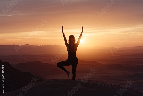 Woman practicing yoga at sunset on a mountain peak with a colorful sky
