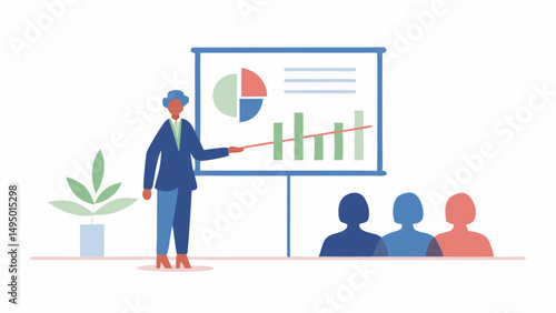 Woman presenting a pie chart and bar graph to an audience in a business meeting presentation setting