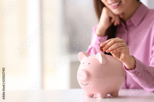Woman putting coin into piggy bank at table indoors, closeup. Space for text