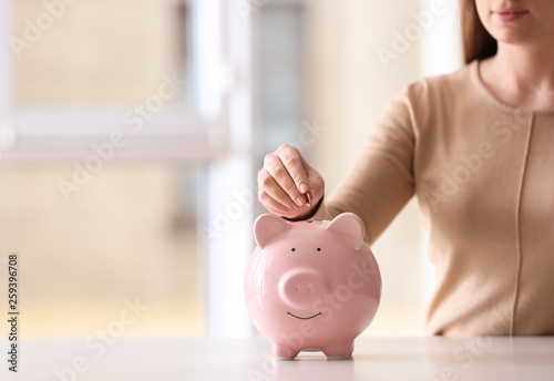 Woman putting coin into piggy bank at table indoors, closeup. Space for text