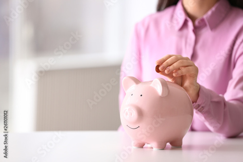 Woman putting coin into piggy bank at table indoors, closeup. Space for text