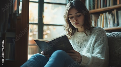 Woman read and book in home or portrait door way and sitting on floor for comfort with literature or novel for hobby Fiction fantasy and knowledge or information on weekend apartment a : Generative AI