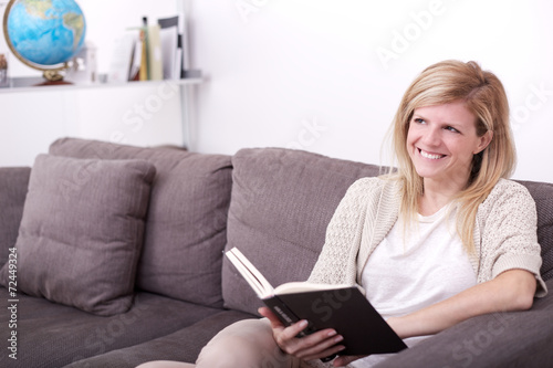 woman reading a book on sofa