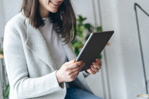 Woman reading good news on tablet display and smiling