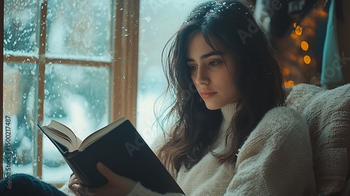 Woman reads book by snowy window, cozy winter scene