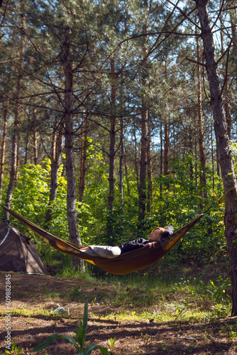Woman relaxing in the hammock in the middle of a pine forest, watching sundown. Slow life concept. Hipster. Camping tent. Vertical photo