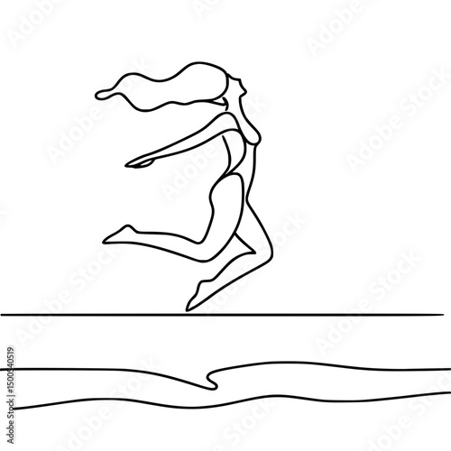 Woman running freely and joyfully on the beach in one line vector outline