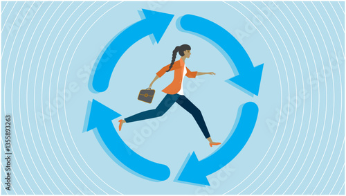 Woman running in spinning arrows in circle. Dimension 16:9. Vector illustration.