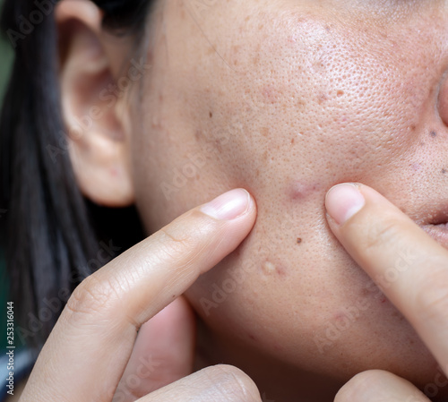 Woman 's problematic skin , acne scars ,oily skin and pore, dark spots and blackhead and whitehead on the face.