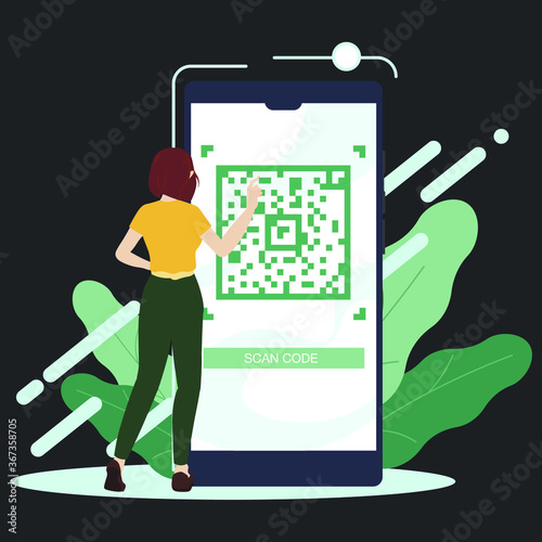 Woman scan QR-code. Human near big phone. Girl using device. Illustration for web