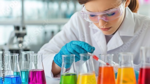 Woman Scientist Conducting Experiment in Laboratory with Colorful Glassware and Chemical Reactions
