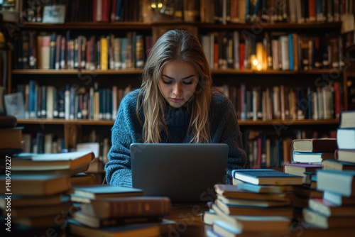 Woman seated at table with laptop in front, surrounded by full bookshelf.
