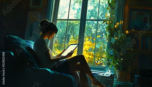 Woman seated by a window, engrossed in a digital device.