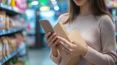 Woman Shopping in a Grocery Store Using a Smartphone