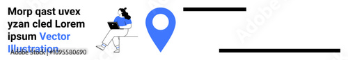 Woman sits on chair with laptop, blue location pin, placeholder text. Ideal for tech, work-from-home, location services, online content, digital workplaces, productivity, software promotions. Landing