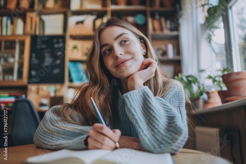Woman sitting at a table with a pen in her hand. Suitable for office and business concepts