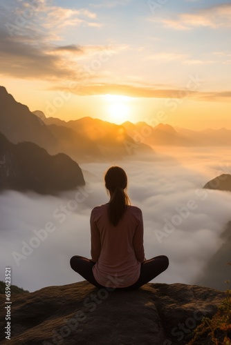 Woman sitting yoga pose on a rock at sunrise in the morning