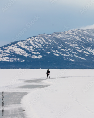 Woman skating on frozen lake in northern Canada with huge mountains in the background surrounded by snow, snow capped and glassy ice on lakes surface.