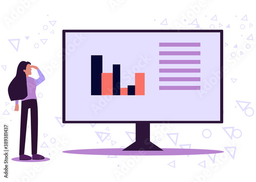 Woman standing near big computer monitor and the infographics on the background. Work with data, analysis. Isolated flat vector illustration.