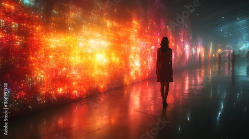 woman stands silhouetted against a wall of vibrant, moving lights