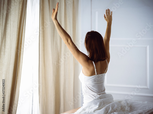 Woman stretching in bed after waking up, back view, entering a day happy and relaxed after good night sleep. Good morning and new day for brunette. Concept of Weekend, holidays