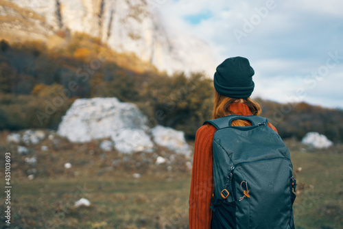 woman tourist in a hat with a backpack climbs the mountains in nature back view