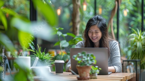 Woman typing laptop for online project, email, or sales proposal in cafe. For writing, networking, and restaurant planning, freelancer, remote worker, or happy woman with digital computer