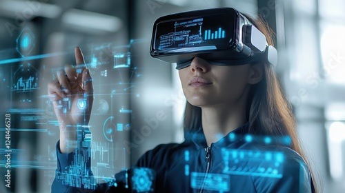 Woman uses VR headset, interacts with digital interface, modern office background, tech presentation
