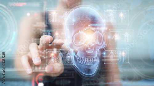 Woman using digital x-ray skull holographic scan projection 3D rendering