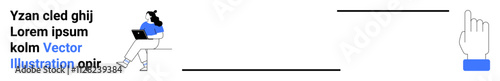 Woman using laptop, sitting on a chair with text beside her, large cursor hand pointing to the right. Ideal for remote work, online education, digital communication, user interface design