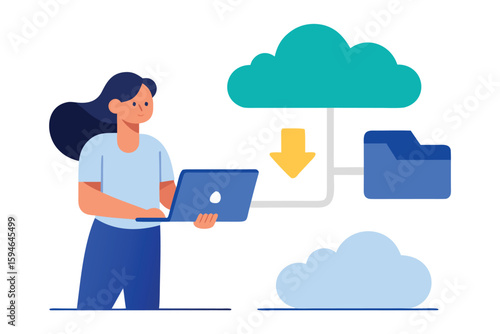Woman using laptop to download files from cloud storage to a digital folder