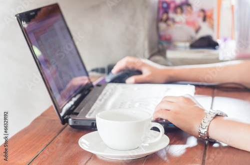 Woman using laptop with a cup of coffee