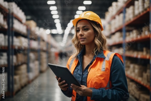 Woman wearing hat and safety suit working in logistics distribution center warehouse while holding digital tablet